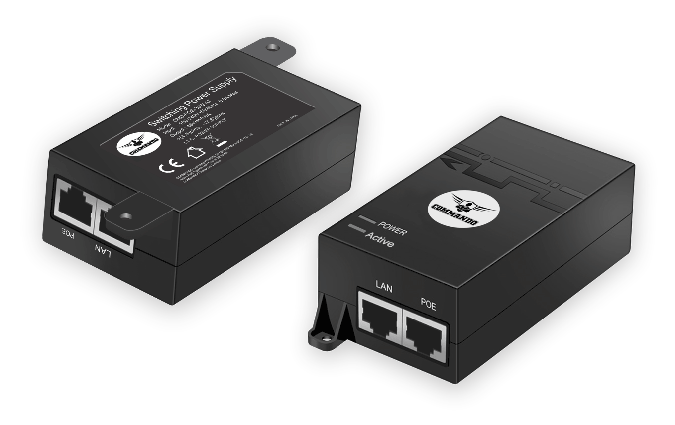 COMMANDO LightningPOWER 10/100/1000Mbps, Max Power 24VDC @ 1A, PoE Injector