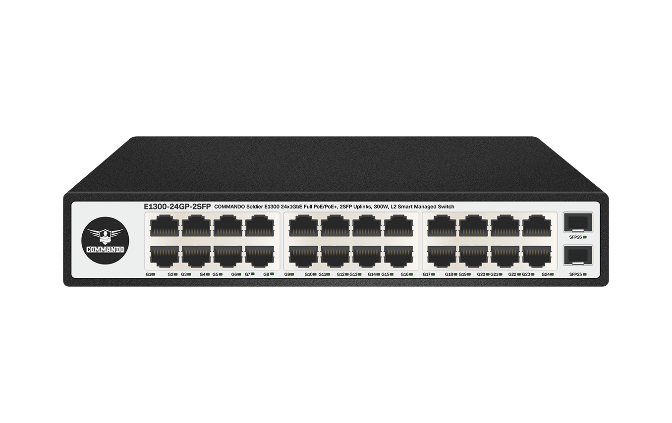 COMMANDO Soldier E1300 24x1GbE Full PoE/PoE+, 2SFP Uplinks, 300W, L2 Smart Managed Switch