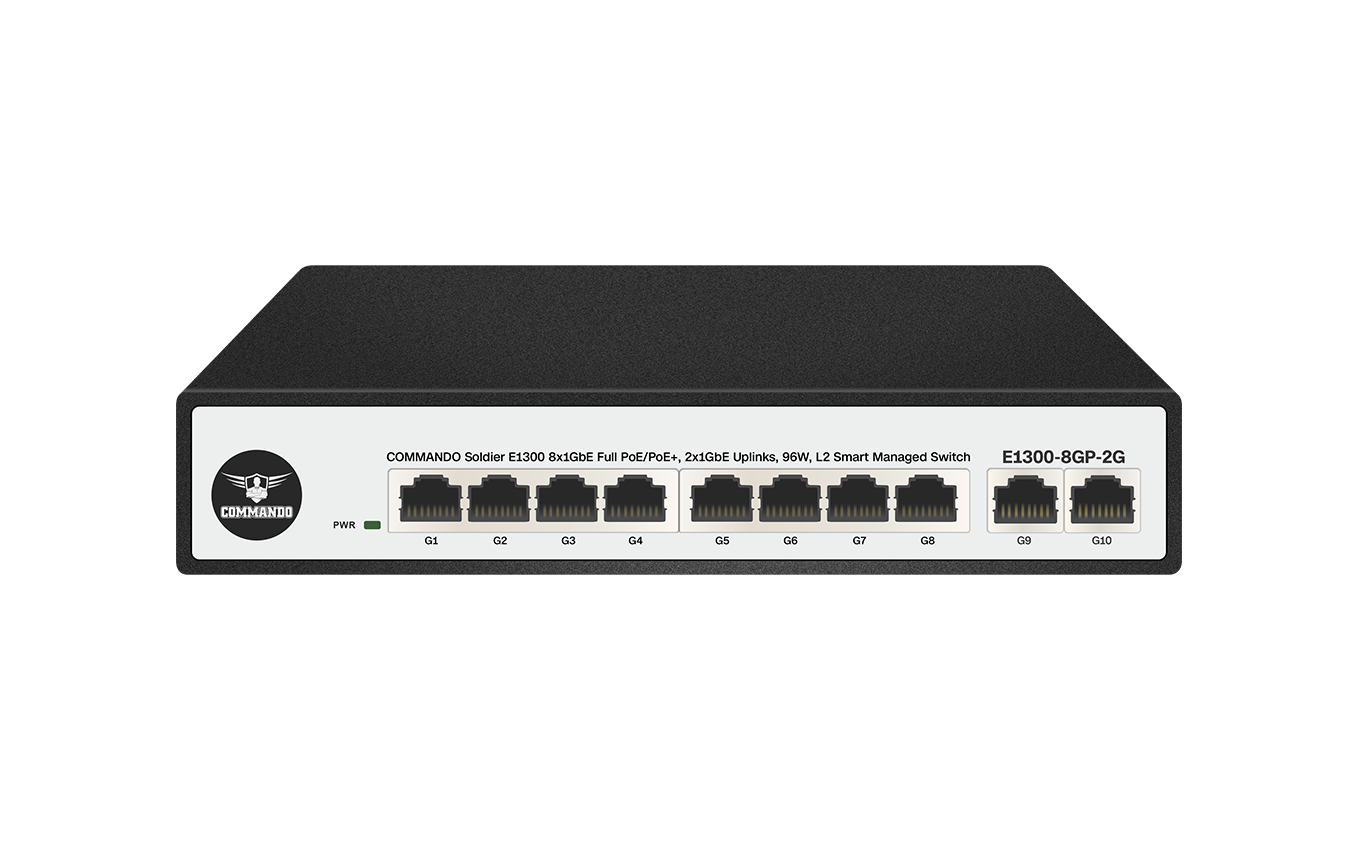 COMMANDO Soldier E1300 8x1GbE Full PoE/PoE+, 2x1GbE Uplinks, 96W, L2 Smart Managed Switch
