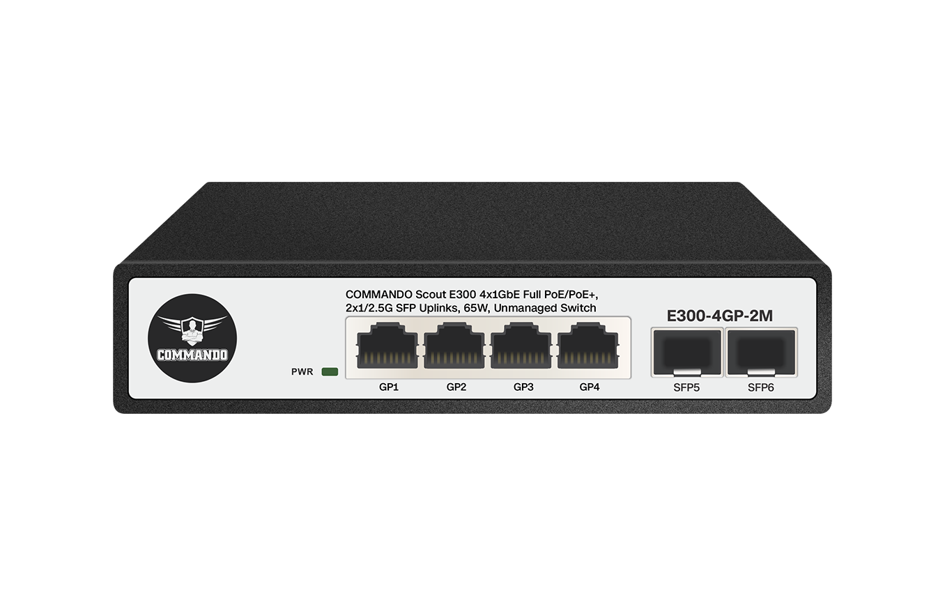 COMMANDO Scout E300 4x1GbE PoE+, 2x1/2.5G SFP Uplinks, 65W, Unmanaged Switch