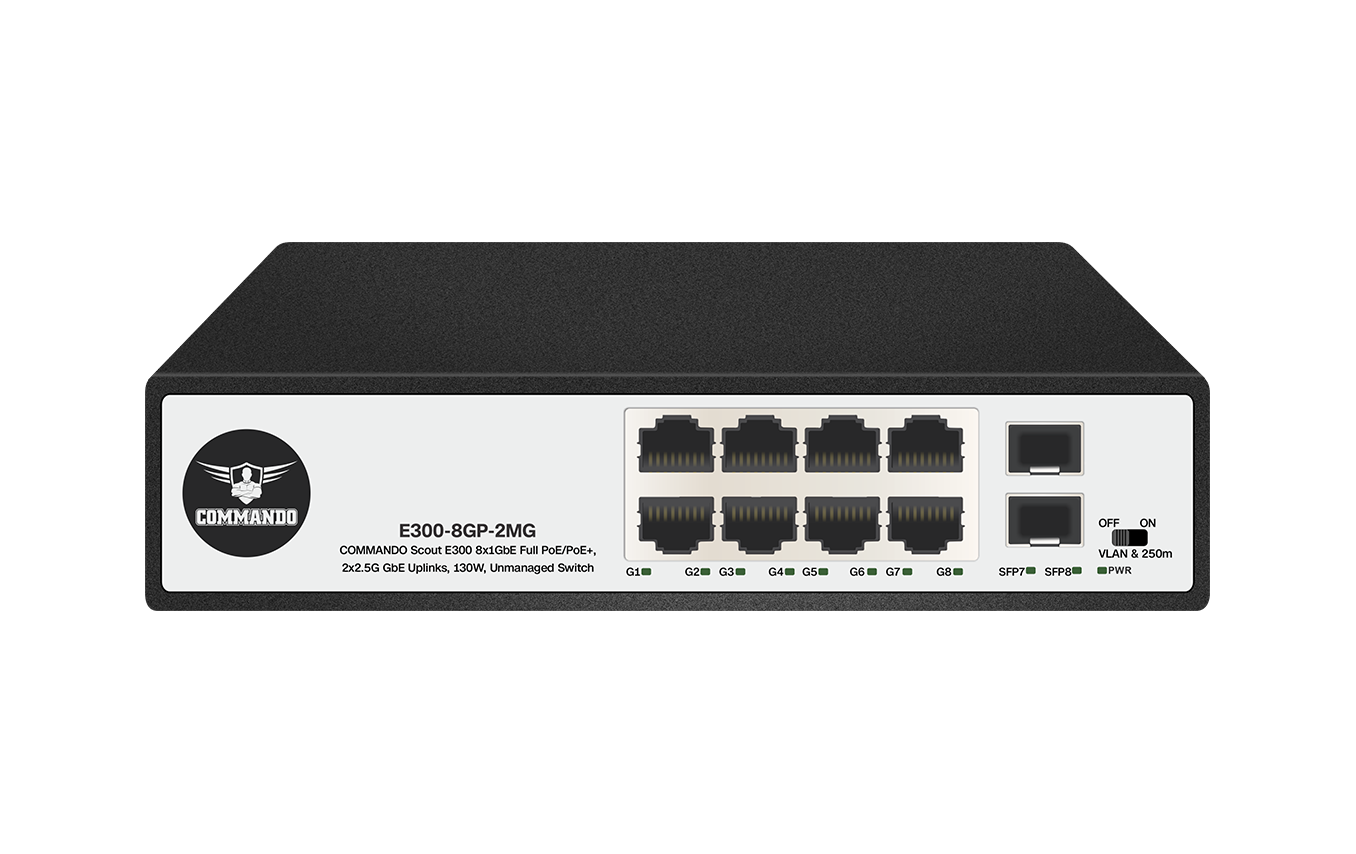 COMMANDO Scout E300 8x1GbE PoE+, 2x2.5GbE Uplinks, 120W, Unmanaged Switch