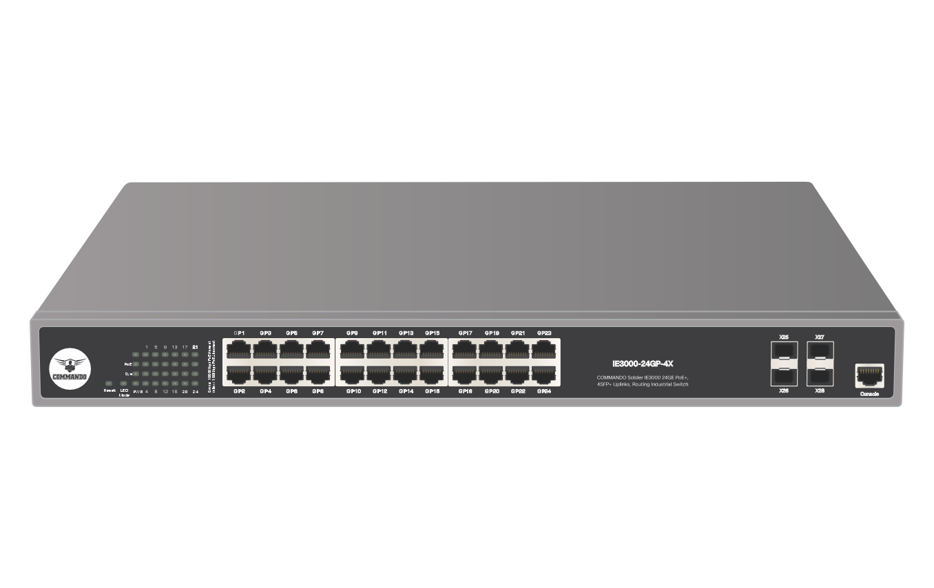 COMMANDO Soldier IE3000 24GE Full PoE/Full PoE+, 4SFP+ Uplinks, Routing Industrial Switch