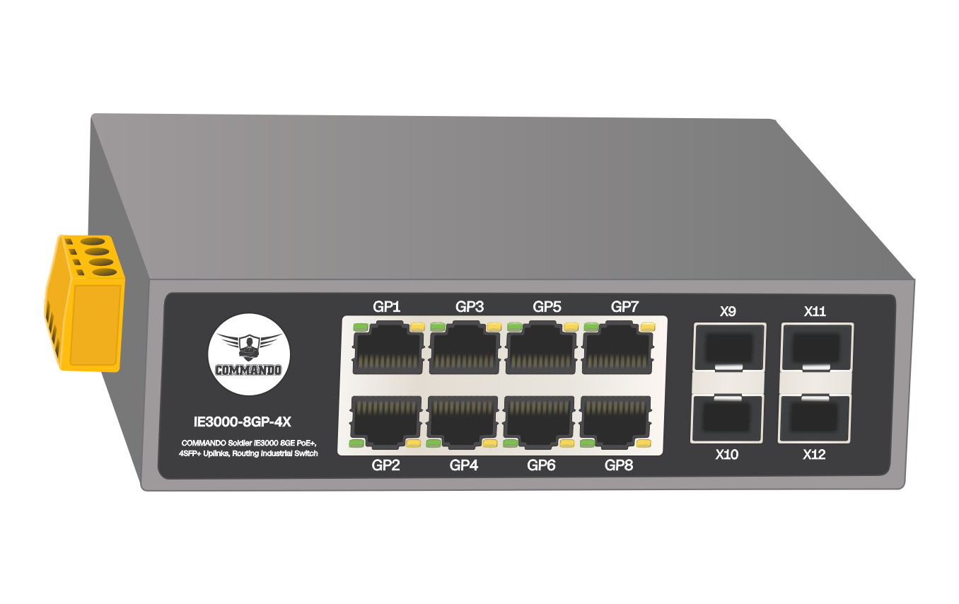 COMMANDO Soldier IE3000 8GE Full PoE/Full PoE+, 4SFP+ Uplinks, Routing Industrial Switch